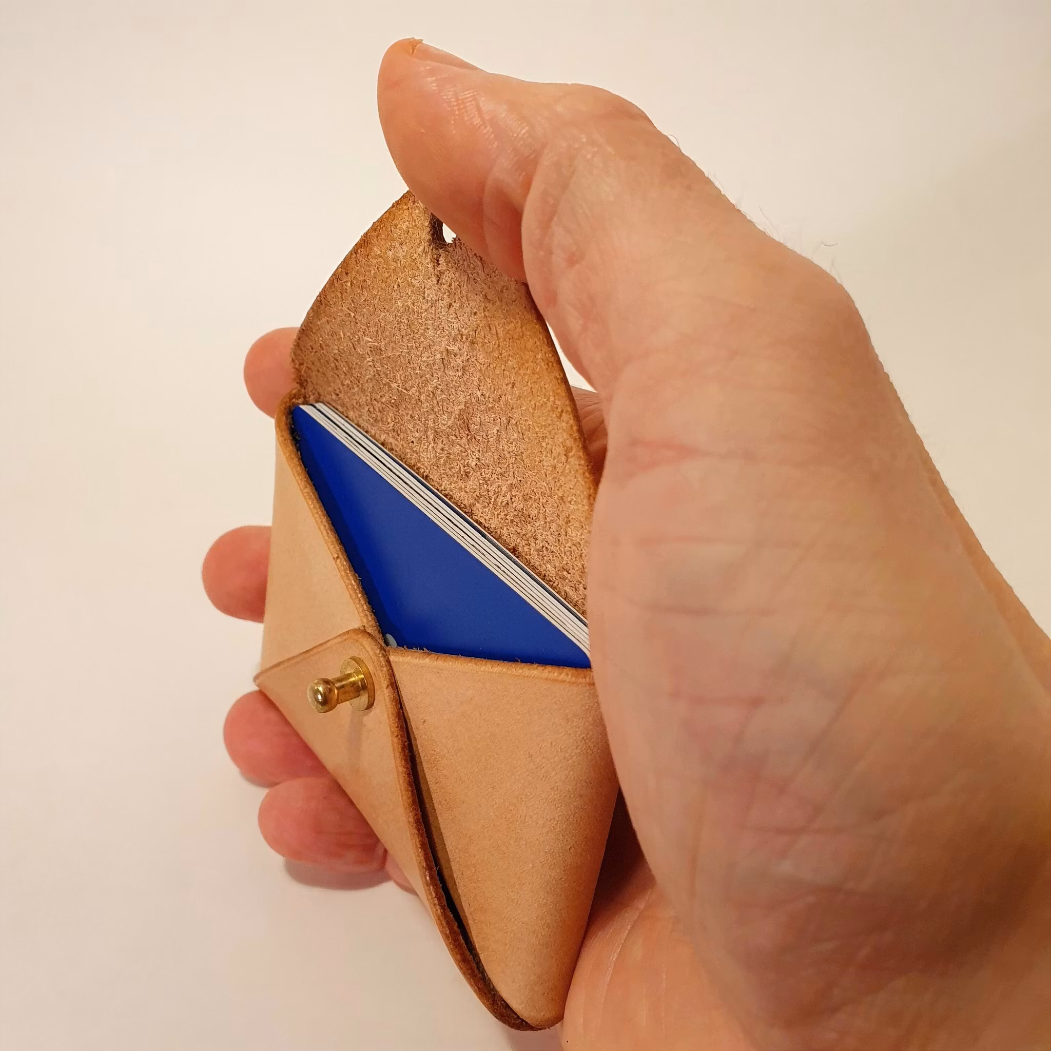 En liten och smidig korthållare i formen av ett kuvert, med gevärsknapp. Rymmer max ca 6-7 kreditkort eller ca 12-14 visitkort av standardstorlek. Till en börja